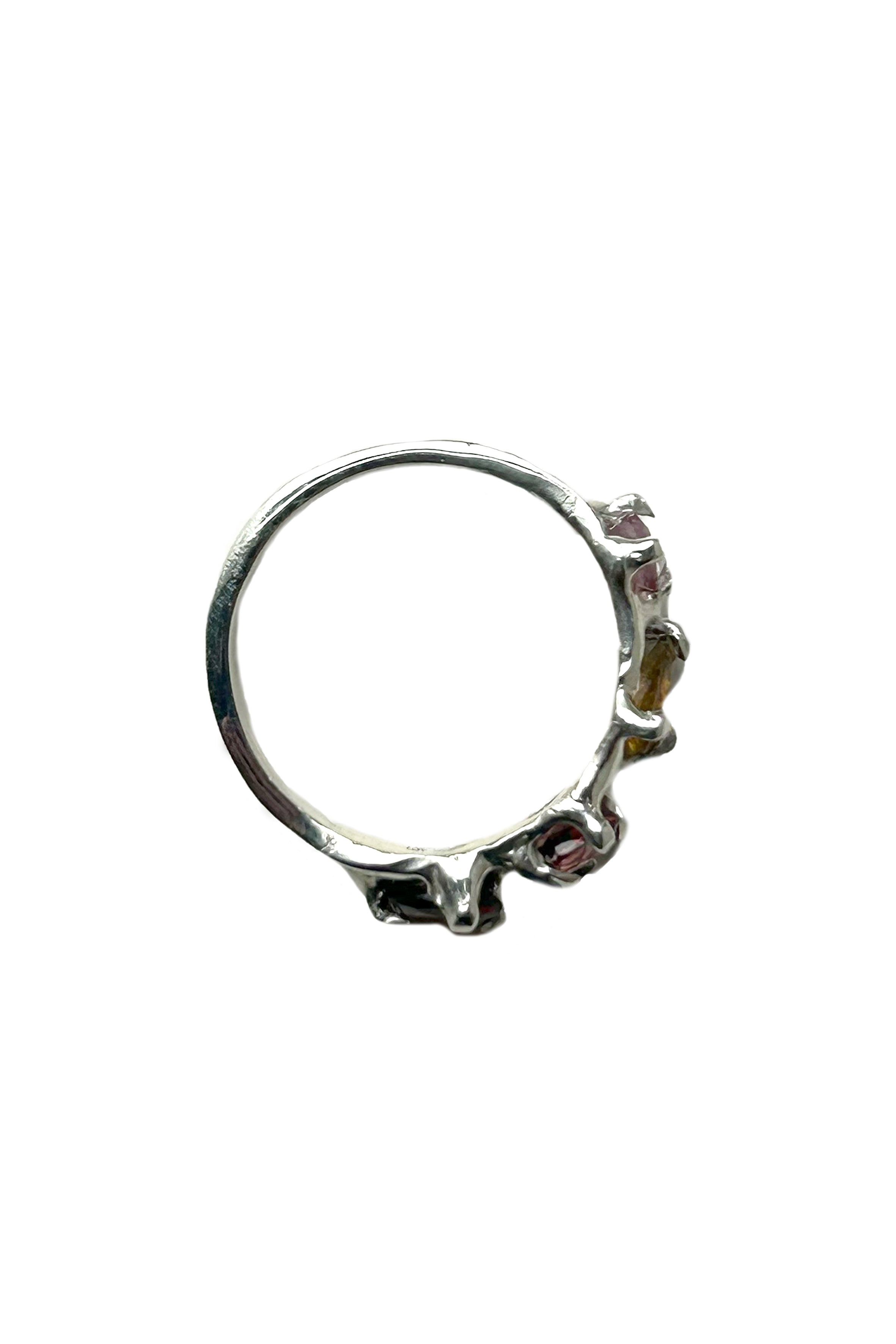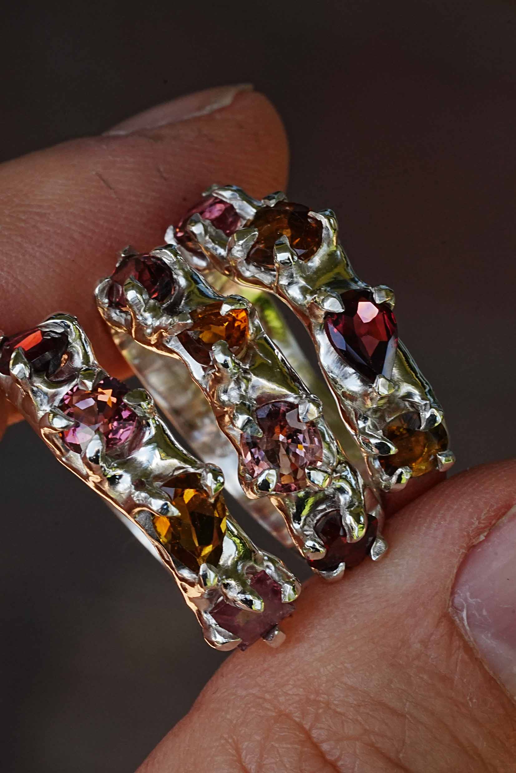 The Emi Ring is based on the Annapurna Ring from designer Emi's most recent collection for Drenched in Jewels, "An ode to the Himalayas. The Sunrise size 8 features a mix of garnet and tourmaline