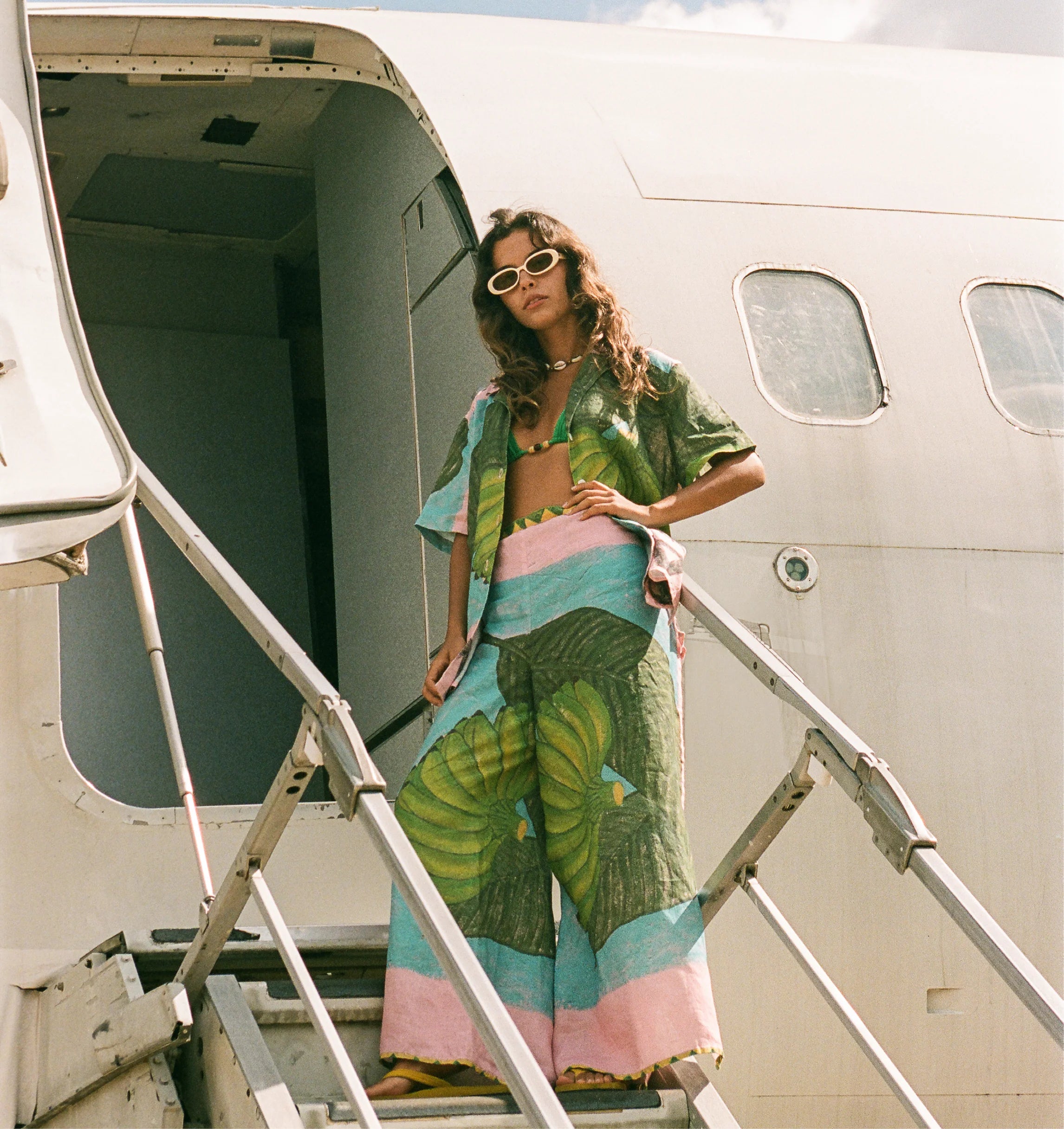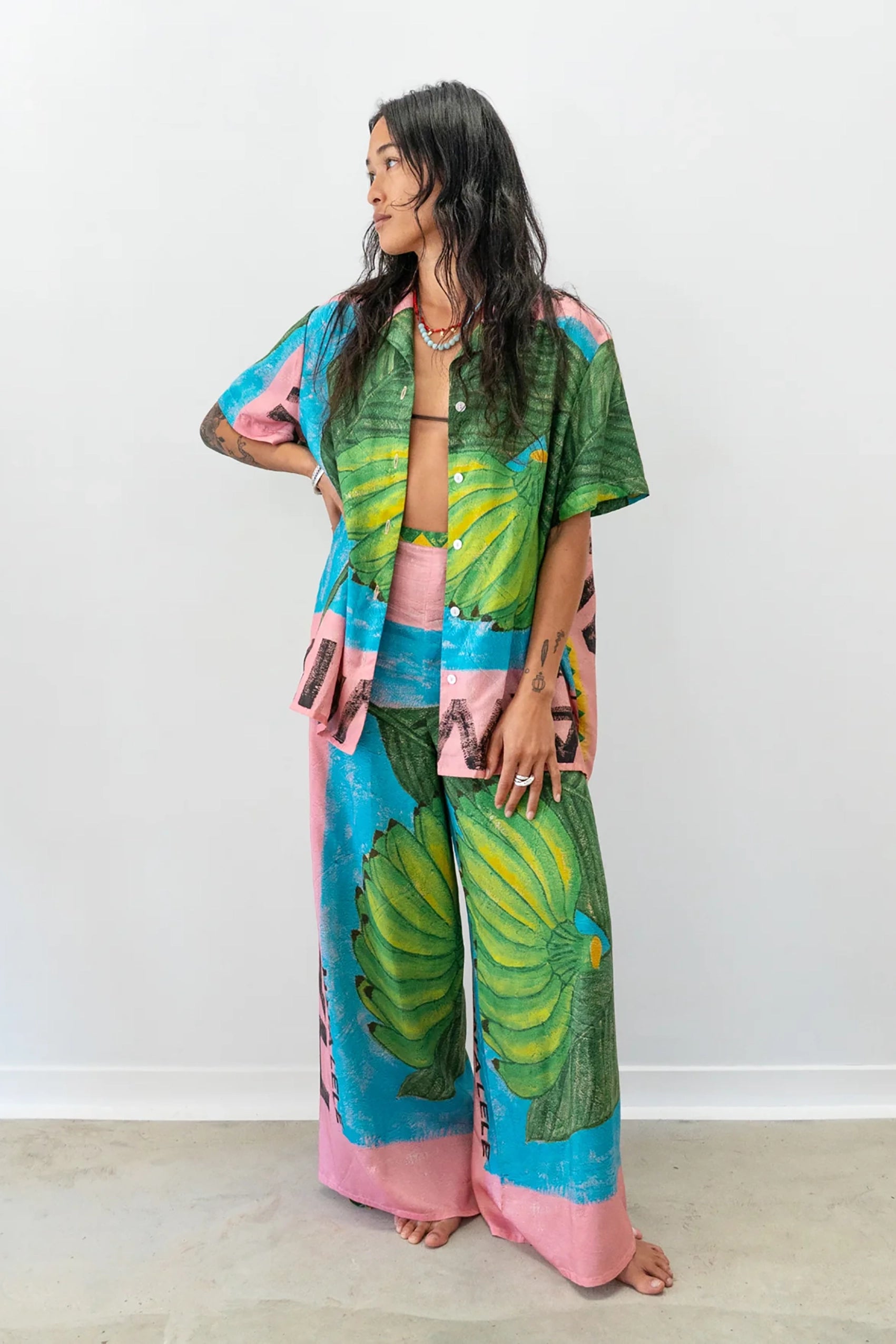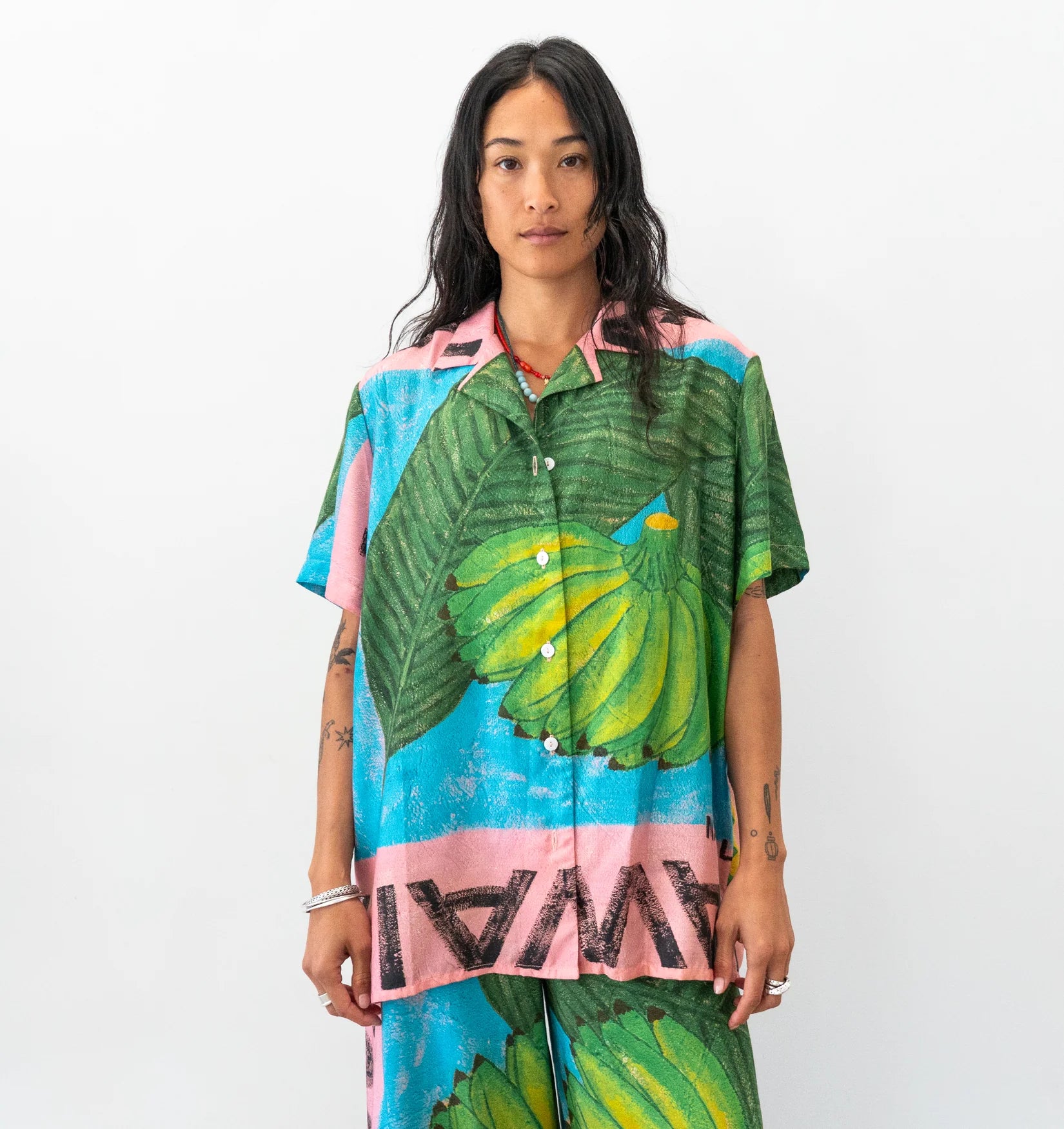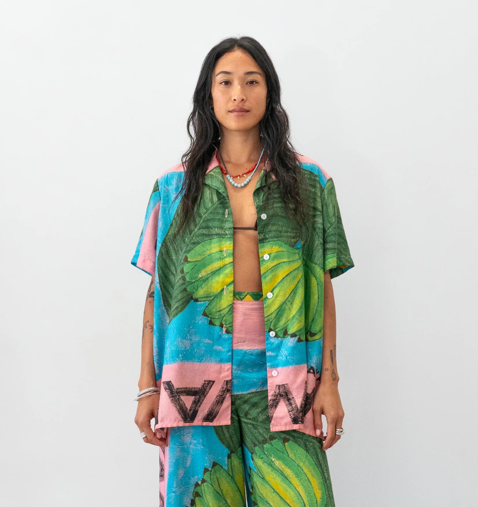 Hand painted artwork by Adrianne Dimitrakakis. It’s a light-weight silk and bamboo blend fabric that’s small to pack and ready to take around the world with you. The silk provides a beautiful sheen to the bamboo thread, making it a piece that can be easily worn day to night.