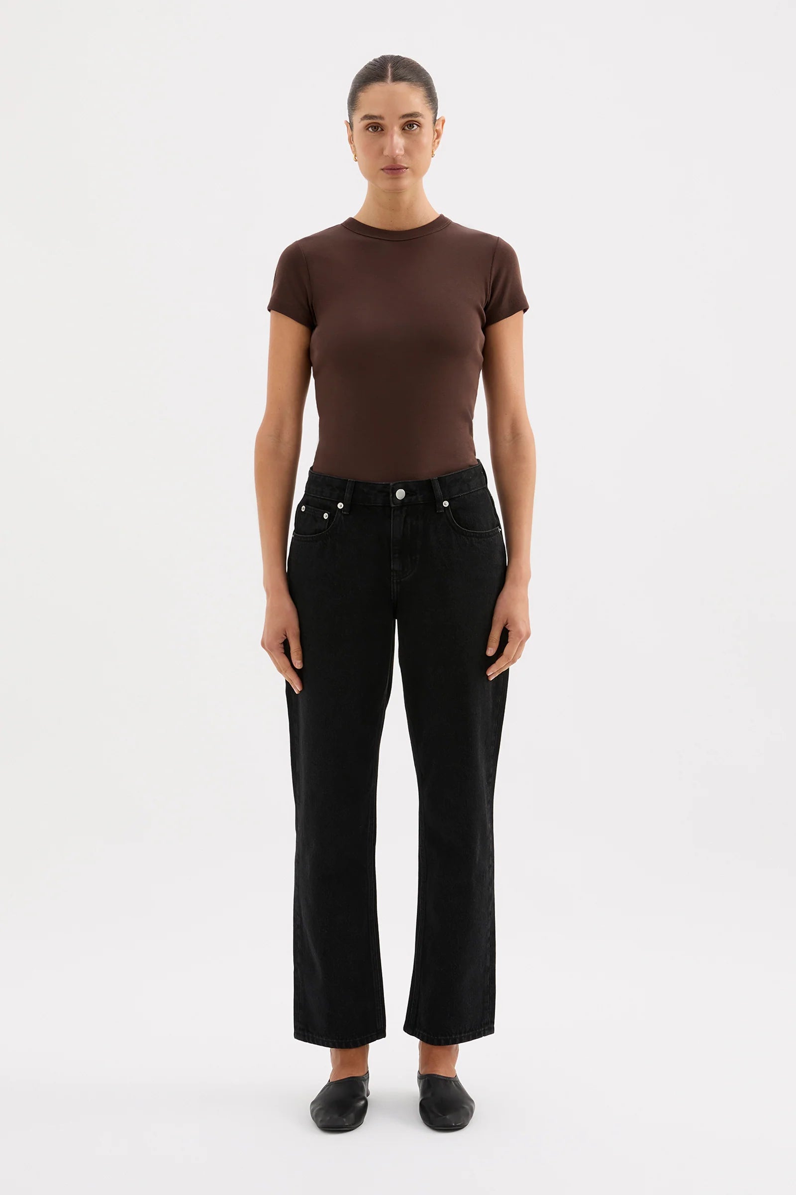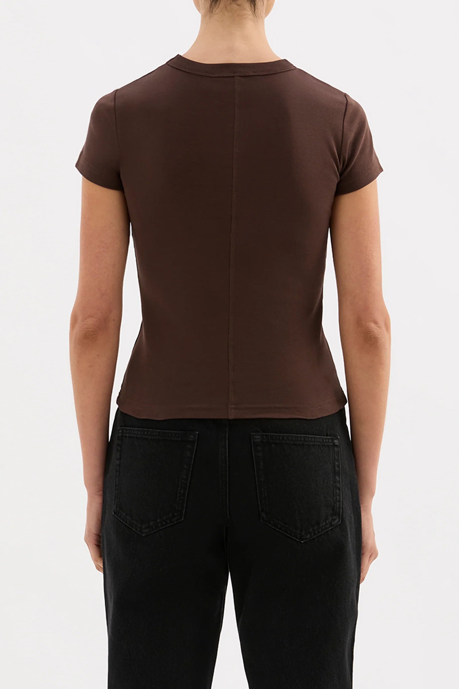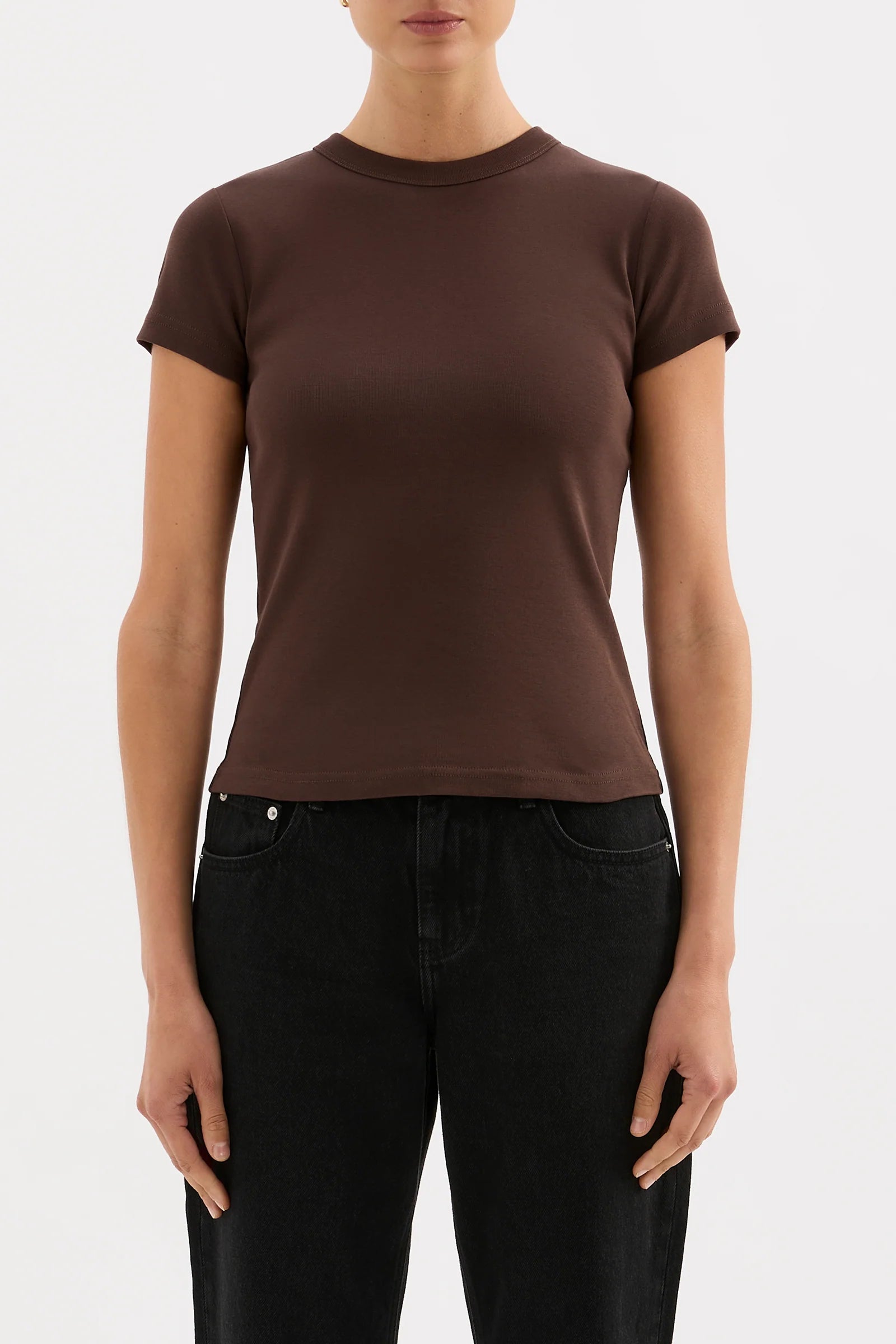 The Organic Baby Tee is made from a lightweight organic cotton jersey, which has a soft, breathable hand feel. The silhouette is a flattering close fit and finishes at the hips. Features include a crew neck, and short, fitted sleeves. This can be tucked in or worn over midrise bottoms.