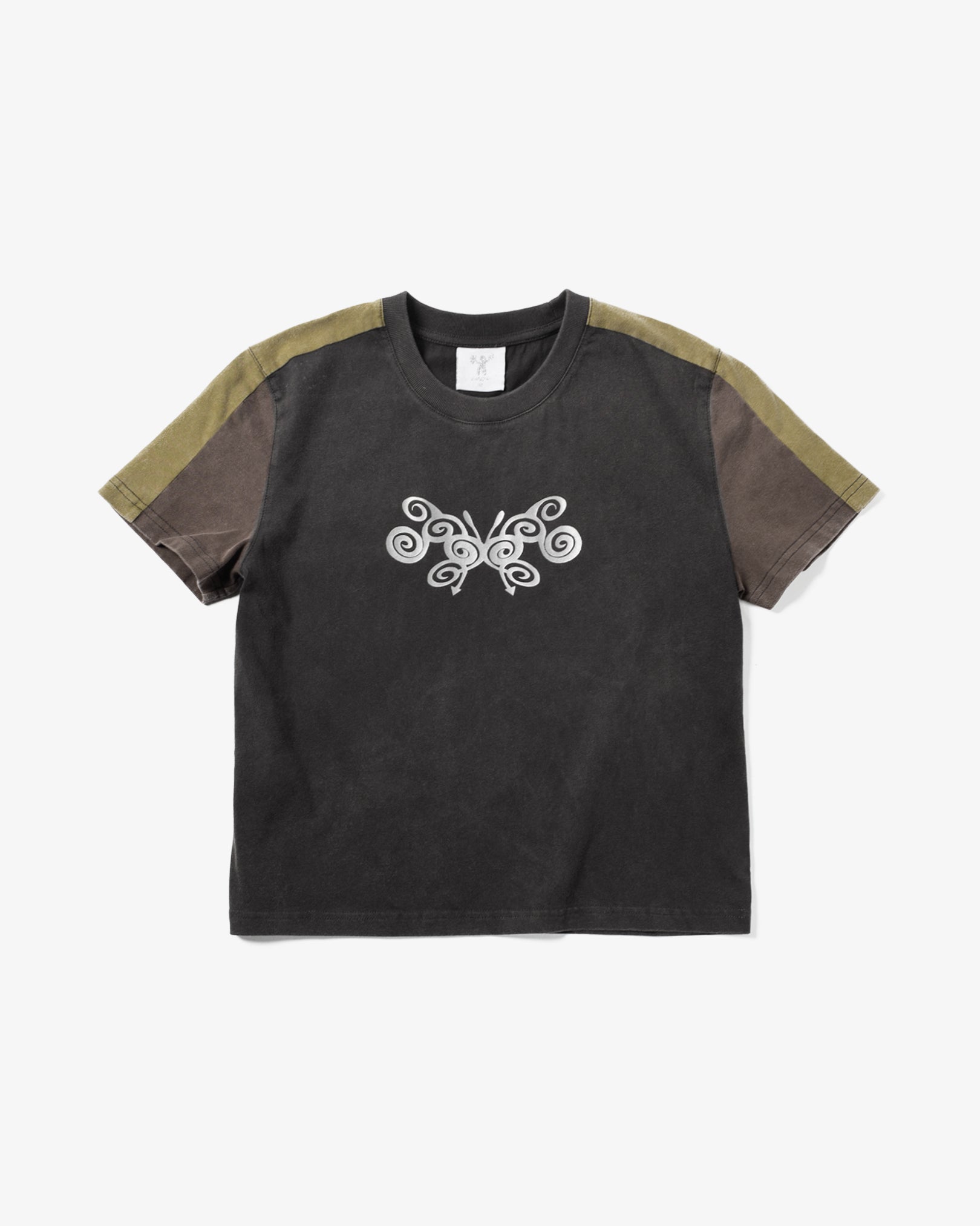 Our Xenica baby tee made from a midweight 200gsm washed cotton fabric. Constructed with colour-blocked arm and sleeve panelling. from A cropped, slightly fitted unisex shape that still allows for a relaxed drape. Finished with a silver screen print at the front.