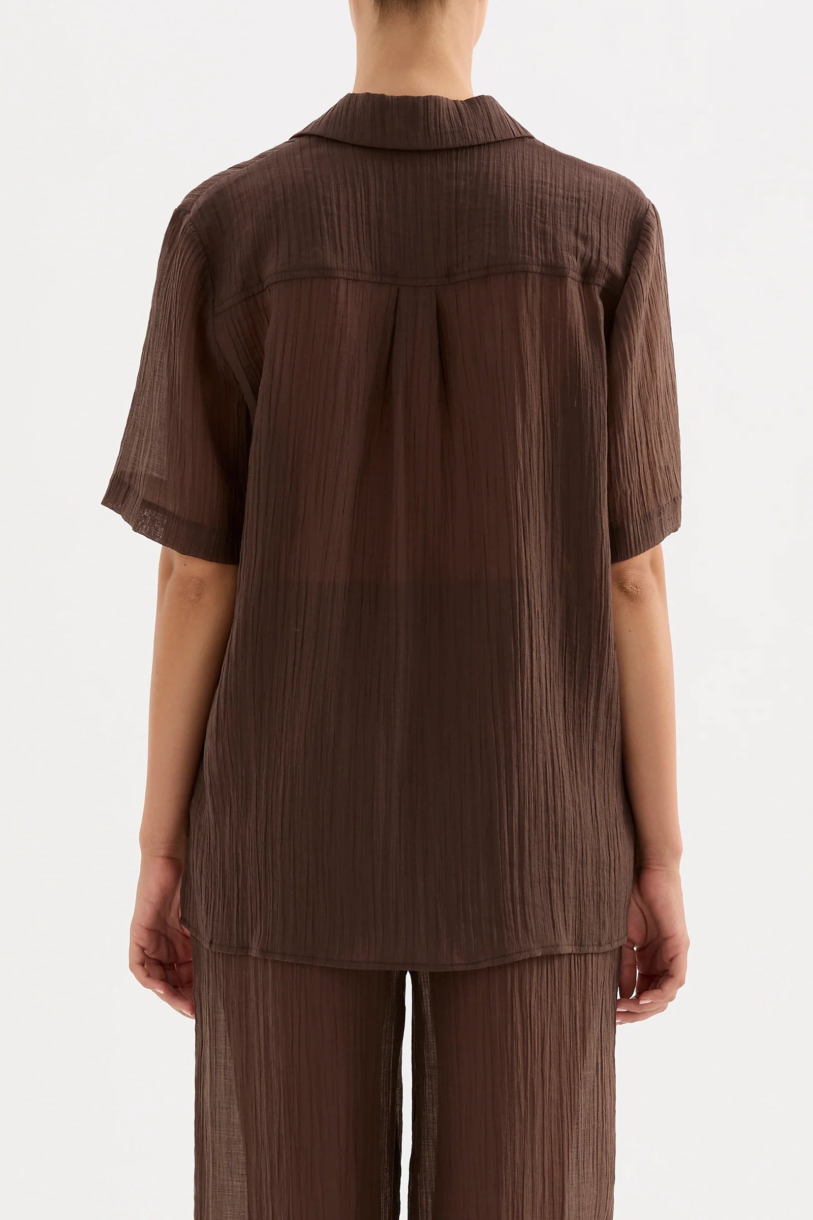 The Maxx Shirt is made from a lightweight, crinkled fabric which has a dry hand feel. The silhouette is an oversized fit, with length finishing at the hip. Features include classic shirting details, front tie closure and slits at hem.