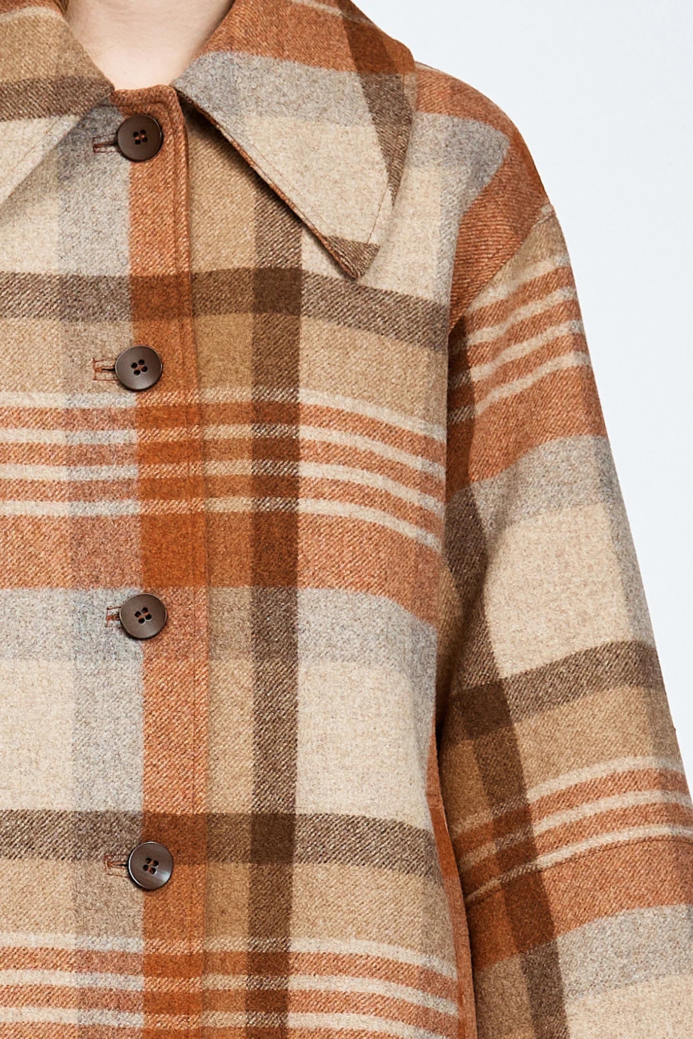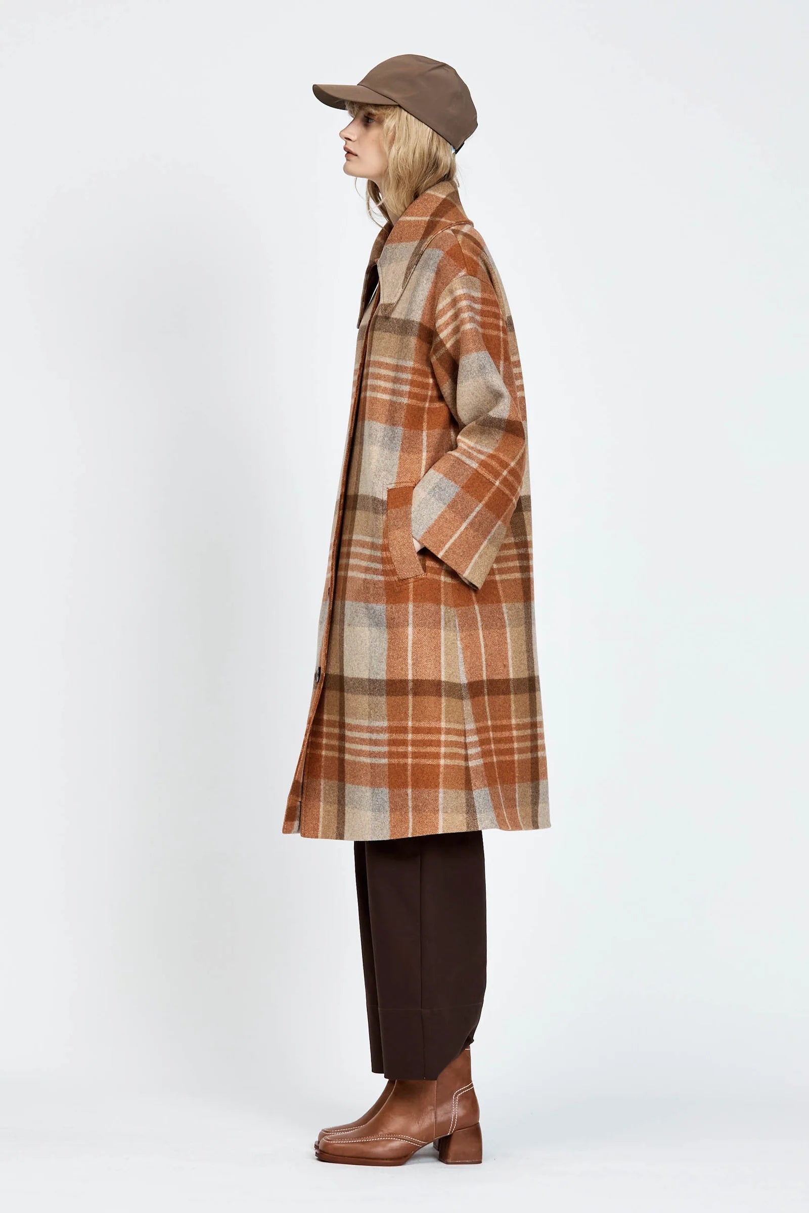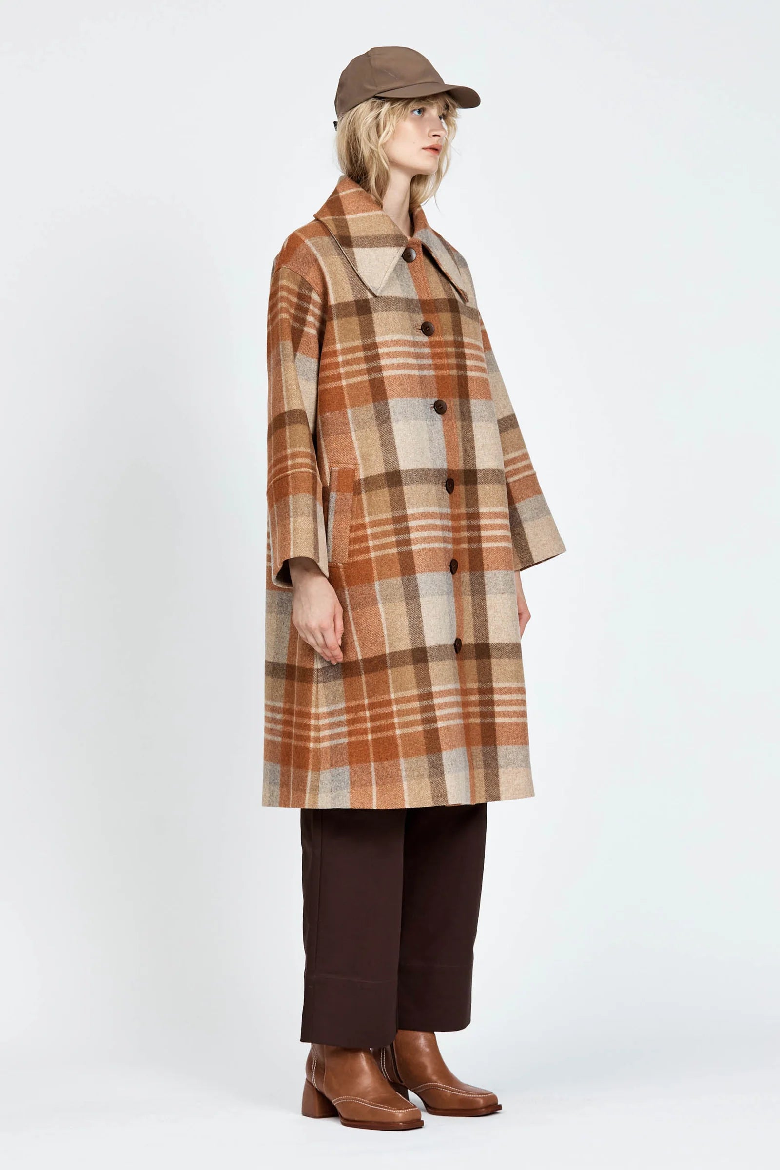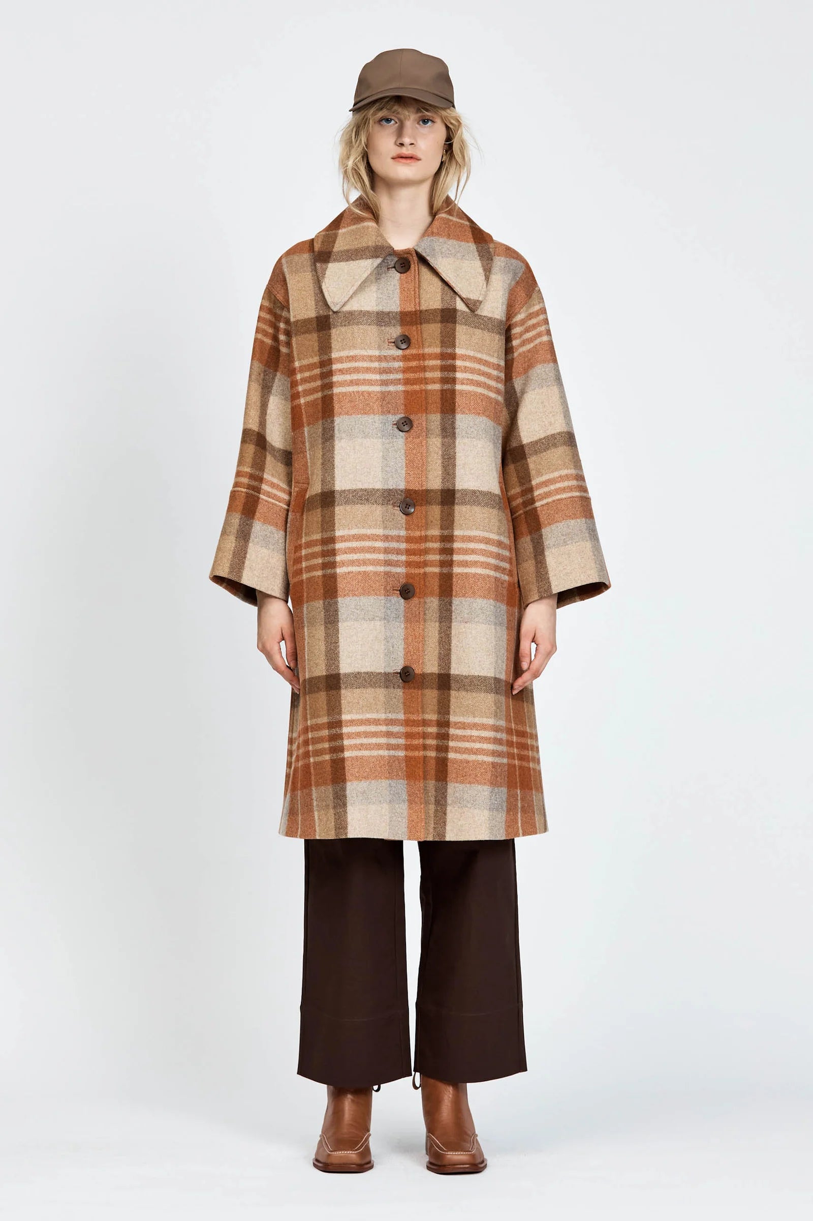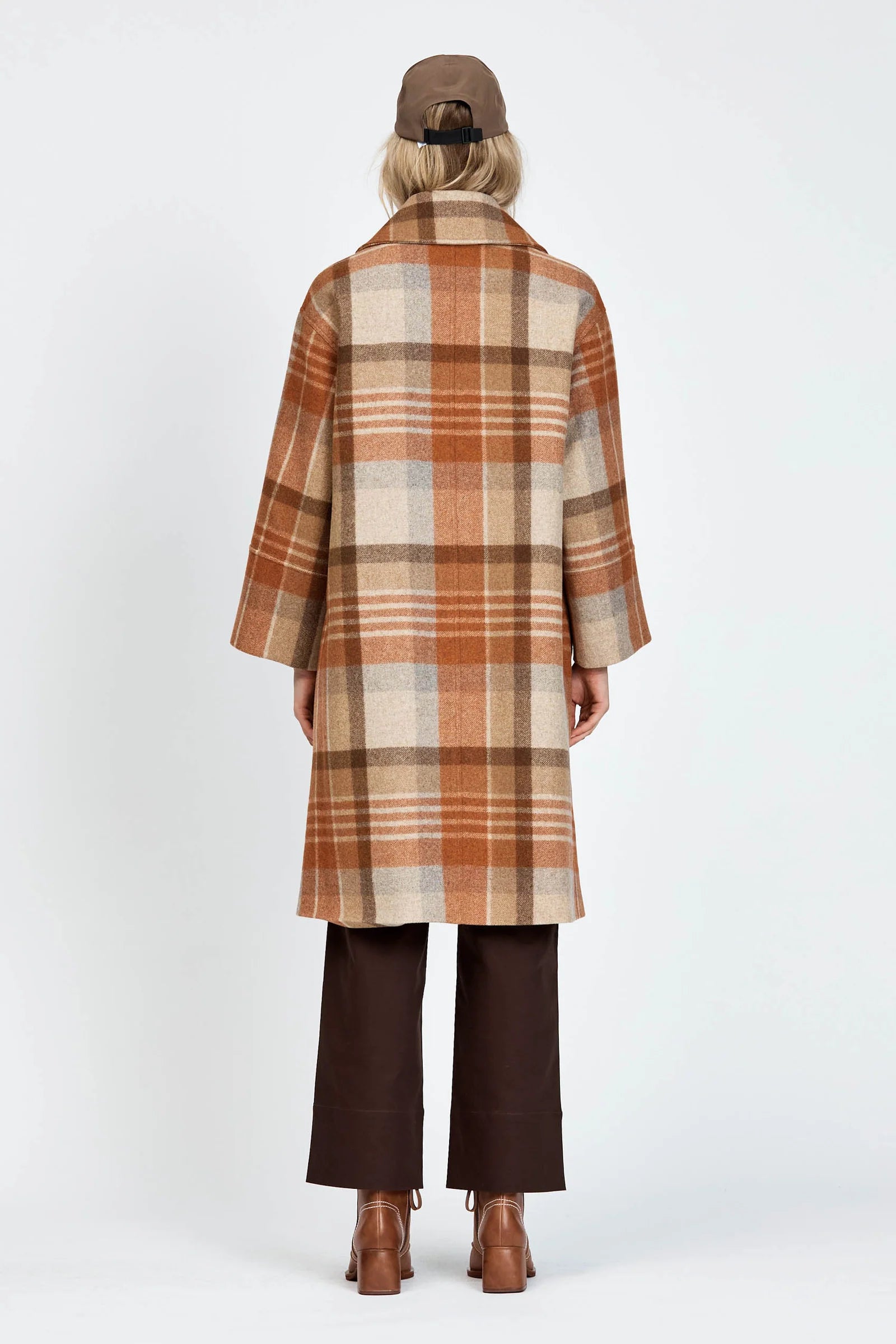 The Varjo Coat is a mid-length silhouette with a button-up front, made from checked wool and fully lined with soft satin. Styled with the Kanala Pant.