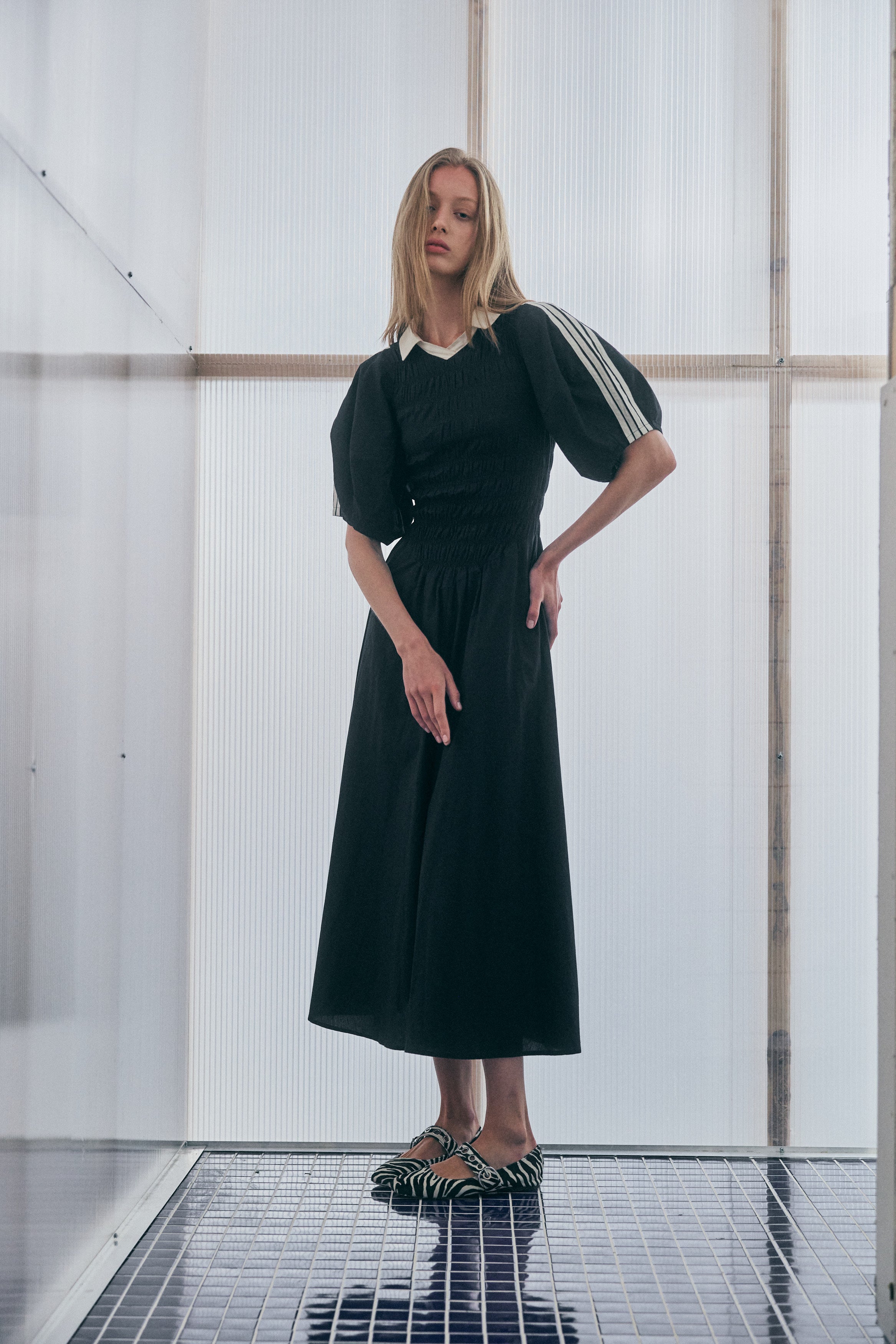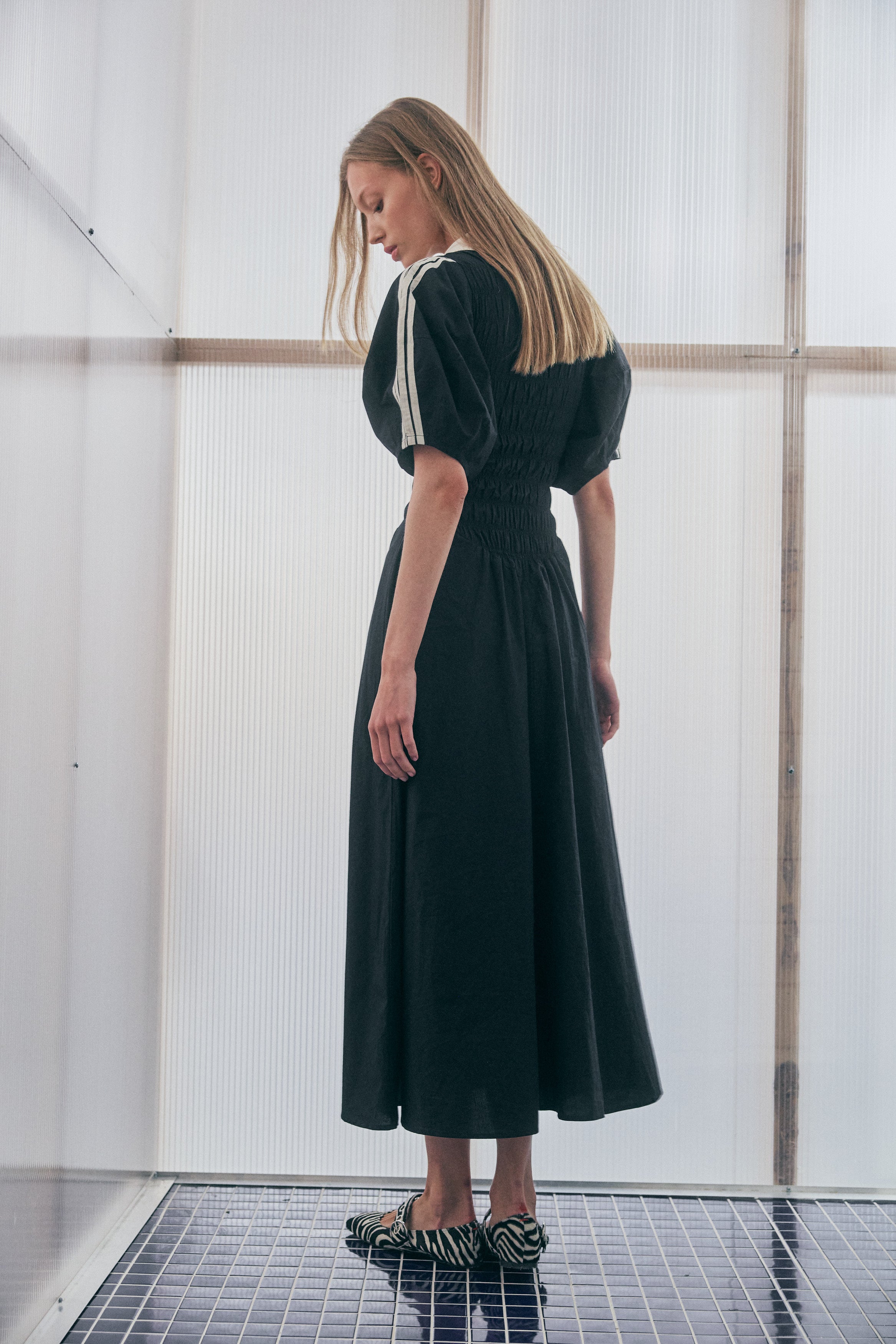 An update to a Muse favourite, the Field Dress with ruching through the body, finished with a contrasting white V-neckline and sporty striped sleeves for a subtle nod to vintage athletic-wear.