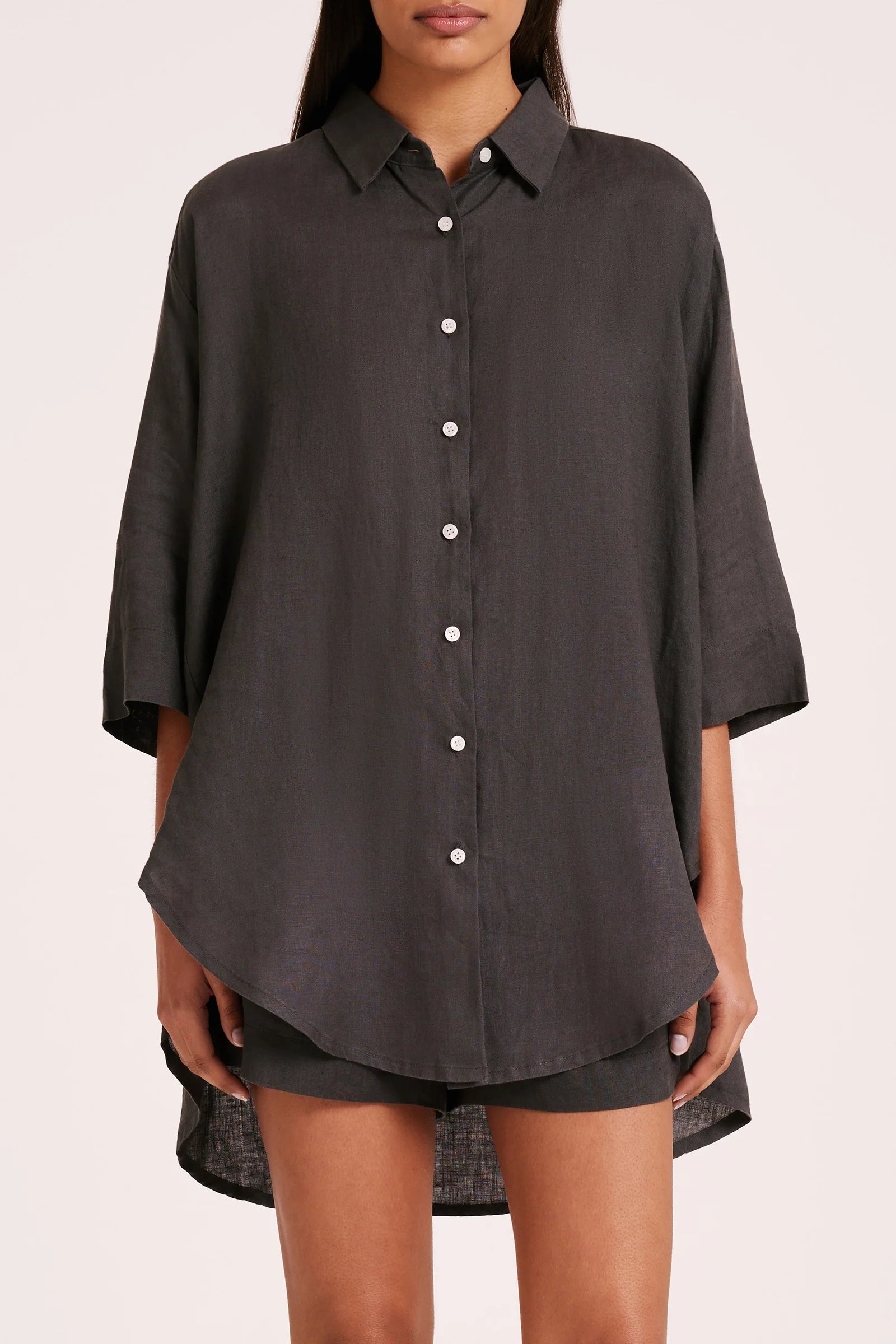 The Lounge Linen Longline Shirt is made in a premium 100% organic French linen which has been washed down for a soft and breathable handfeel. The silhouette is relaxed and oversized with a long billowing hemline and side slits. Features include classic shirt detailing with collared neckline, button front opening, 3/4 sleeves and a Nude Lucy branded label. This Longline Shirt can be worn by itself or paired with a Nude Lounge bottom.