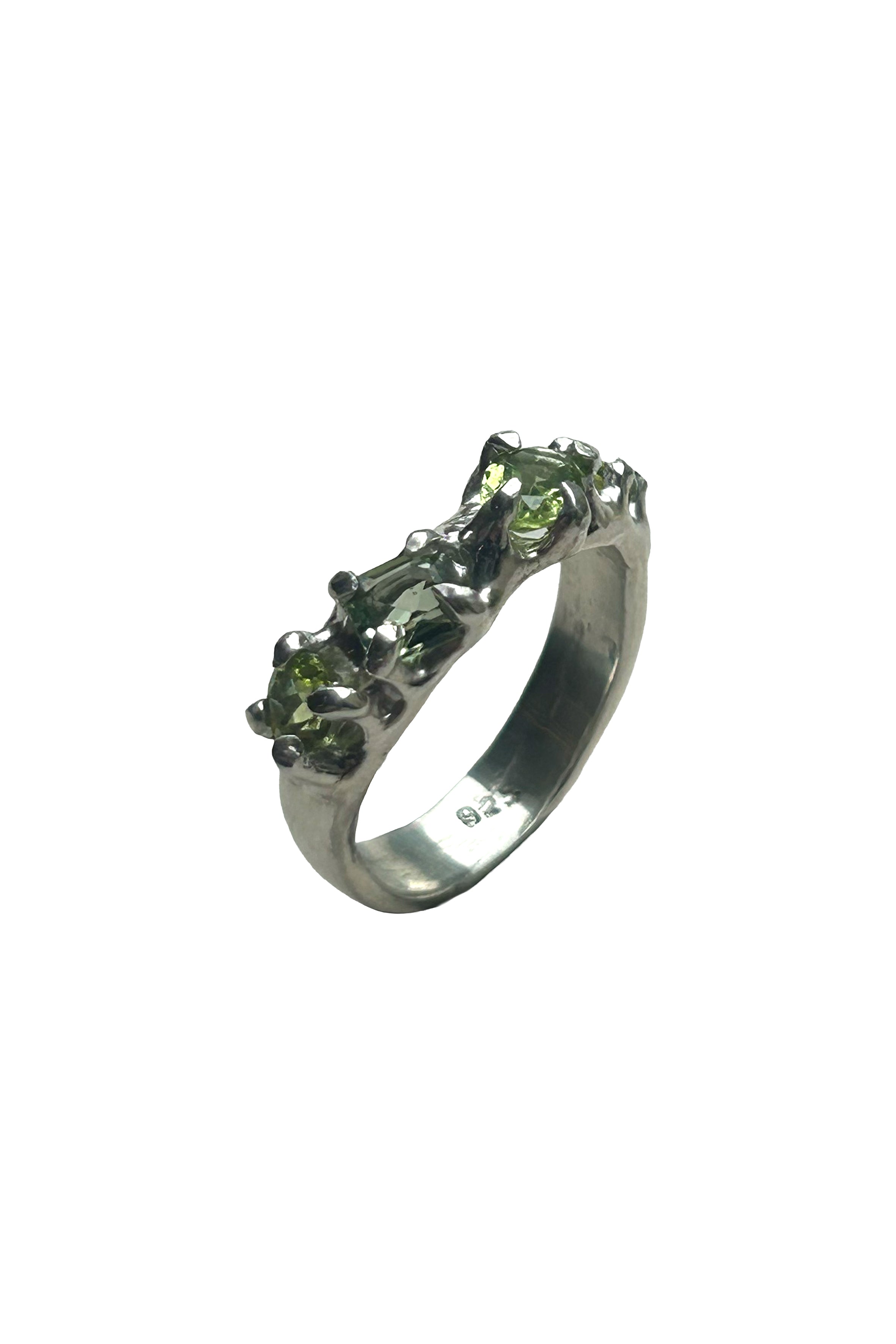 The Emi Ring is based on the Annapurna Ring from designer Emi's most recent collection for Drenched in Jewels, "An ode to the Himalayas. The Emi ring comes in 6 sizes and no two rings are same. The Emi Ring Forest Size 5 has a mix of peridot, tourmaline and blue topaz.