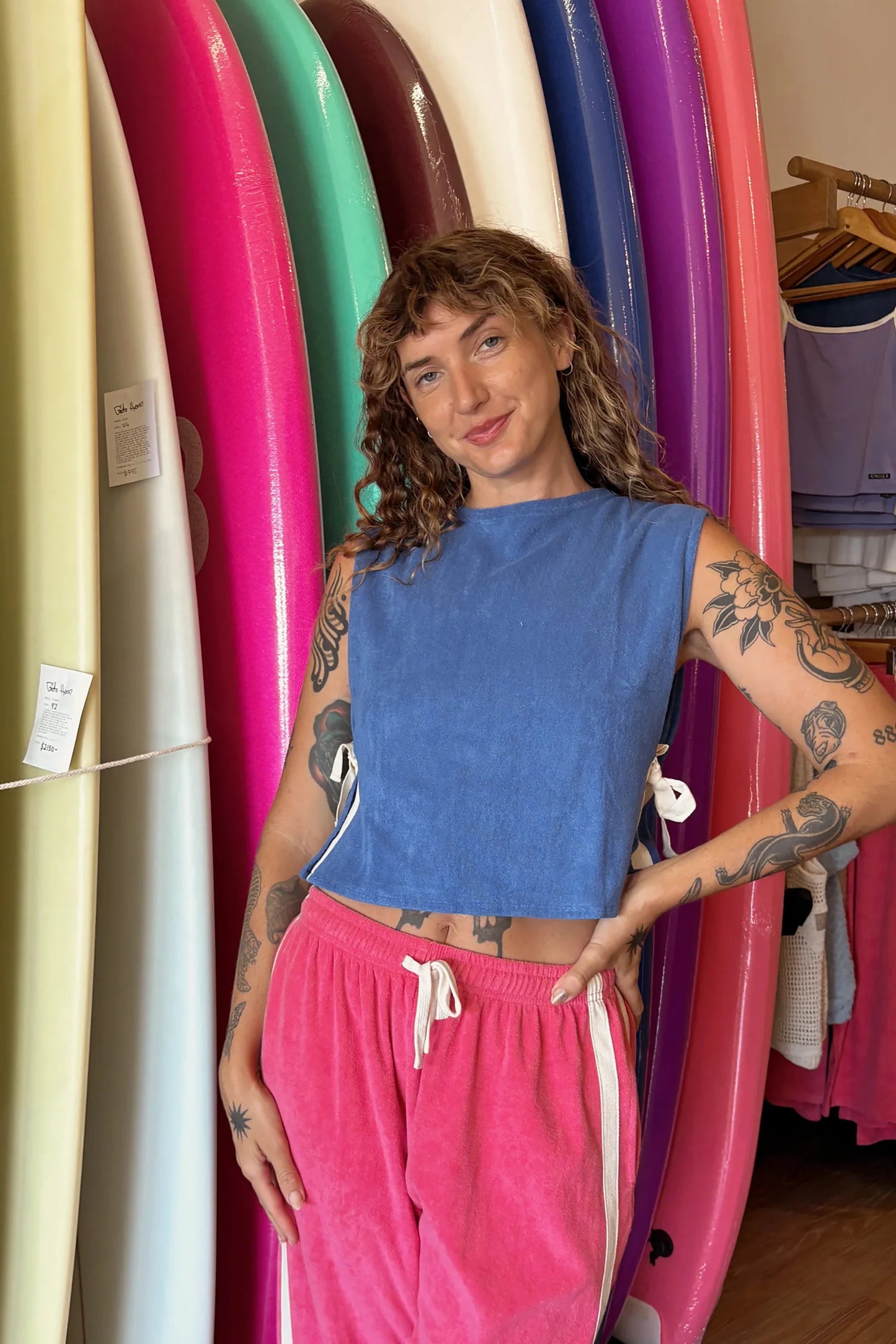 A sporty tank top reimagined in our signature towelling. Side ties and cotton canvas stripes give it a fresh, functional twist. Summer ease with a retro edge.