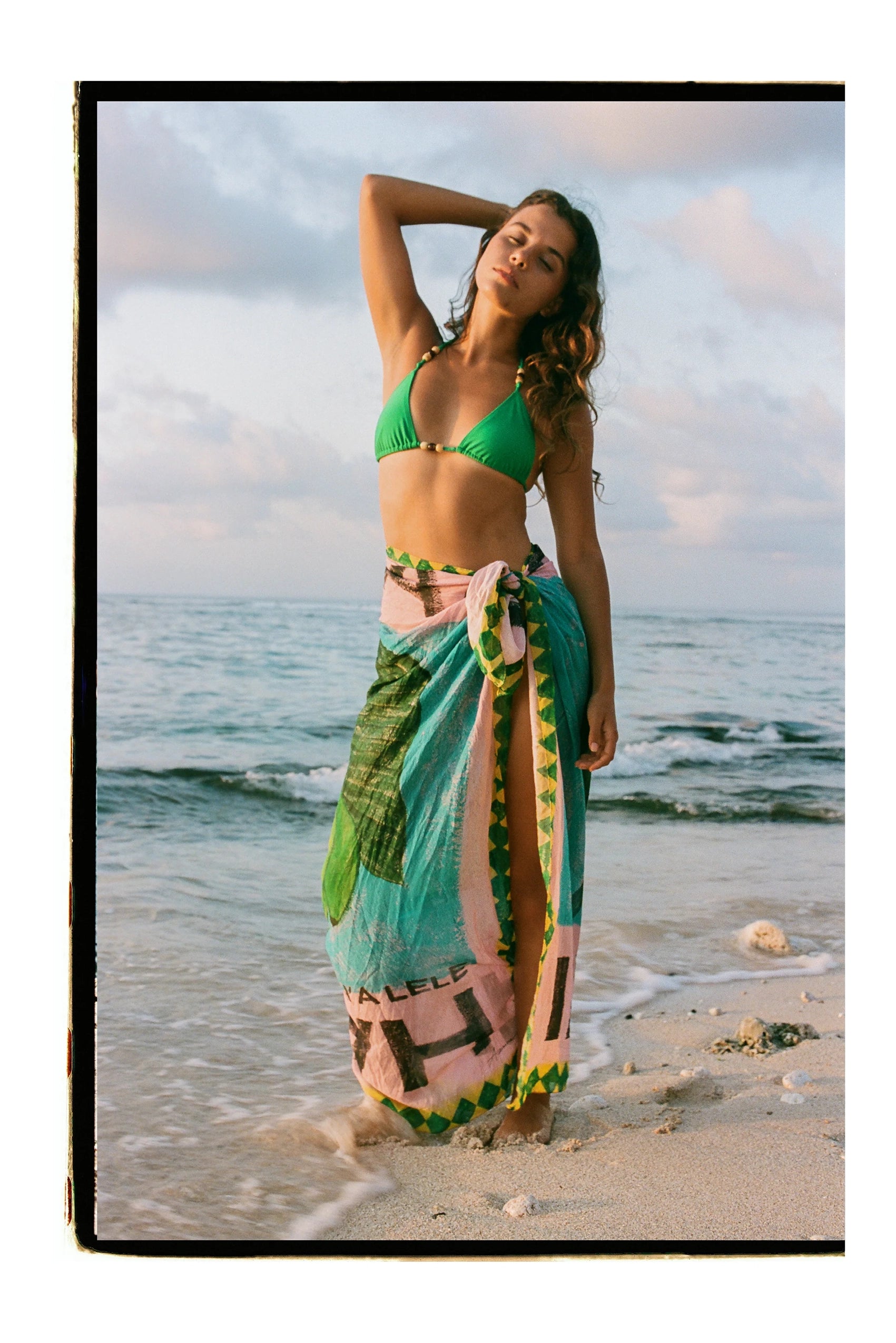 It’s wearable art for the inspired traveller. It can be worn as a long or short sarong, a wrap top or hung in your home as a keepsake of your travels.
